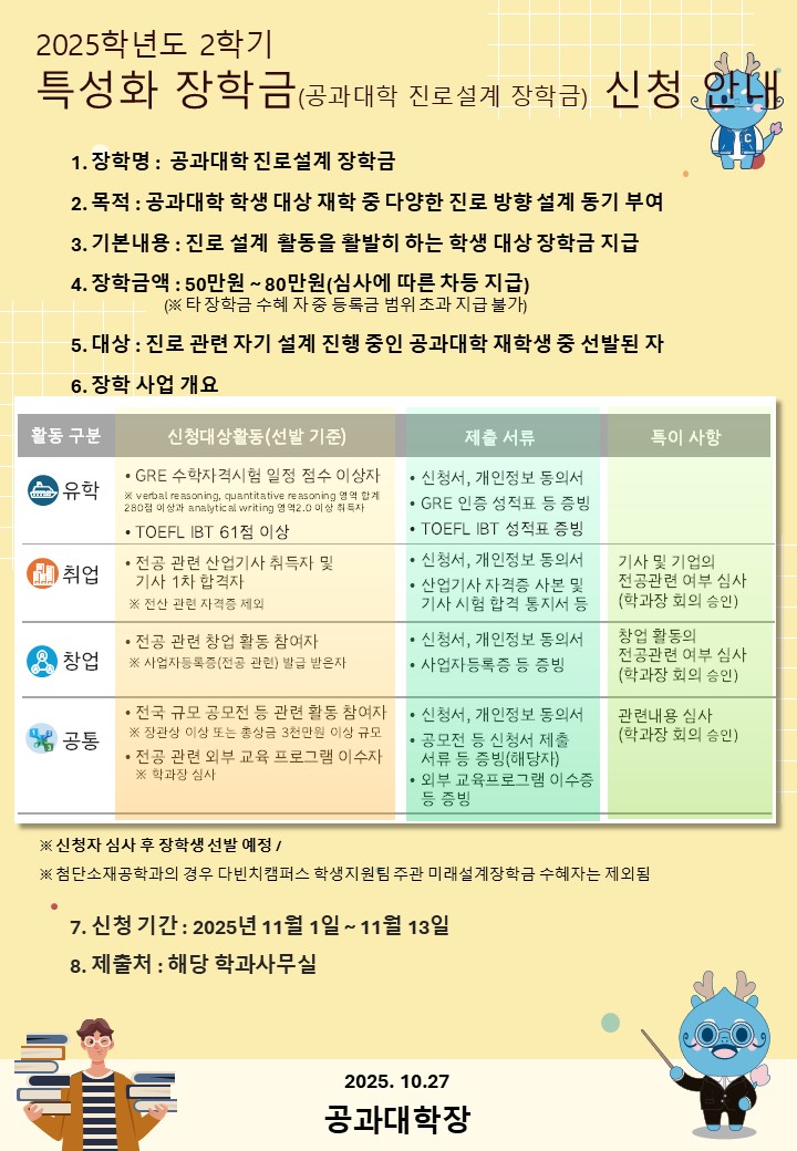 <2025학년도 2학기 공과대학 진로 설계 장학 사업(특성화장학금) 시행 안내>