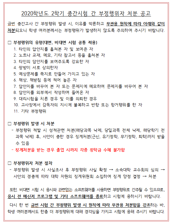 2020학년도 2학기 중간시험 간 부정행위자 처분 공고