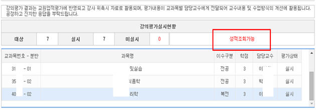 ※ 강의평가실시현황에서 ‘성적조회가능’을 반드시 확인