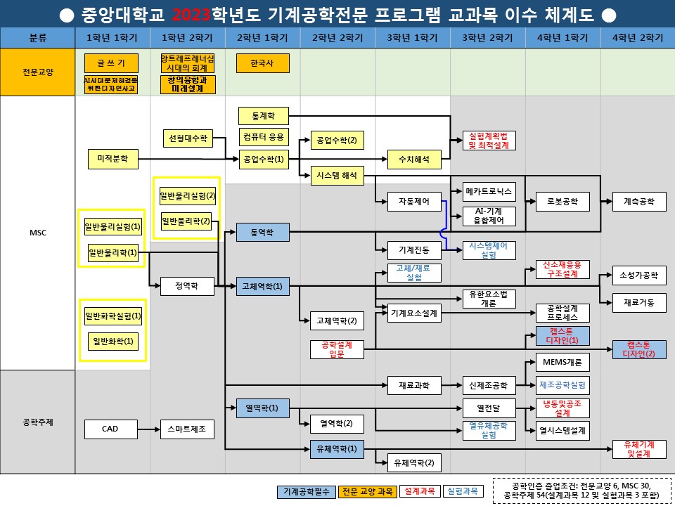 ·설계과목 최소 12학점 포함. ·‘공학설계입문’(설계시작)은 모든 설계과목의 선수과목으로 필수 이수해야 하며 전에 이수한 설계과목의 설계학점은 인정하지 않음. ·‘캡스톤디자인(1)’와 ‘캡스톤디자인(2)’(설계종료) 중 마지막으로 수강한 과목 이후 이수한 설계과목의 설계학점은 인정하지 않음. ·중앙대학교 공과대 전공심화과정 최소 66학점, 전공기초 최소 14학점 이수해야 함. ·15학번 이후부터는 고체/재료실험, 시스템제어실험, 열유체공학실험, 제조공학실험 중 1과목 필수 이수 (14학번 이전은 MSC 과목 중 실험과목 1개 필수 이수) ·본 프로그램의 이수체계를 반드시 준수해야 함. |