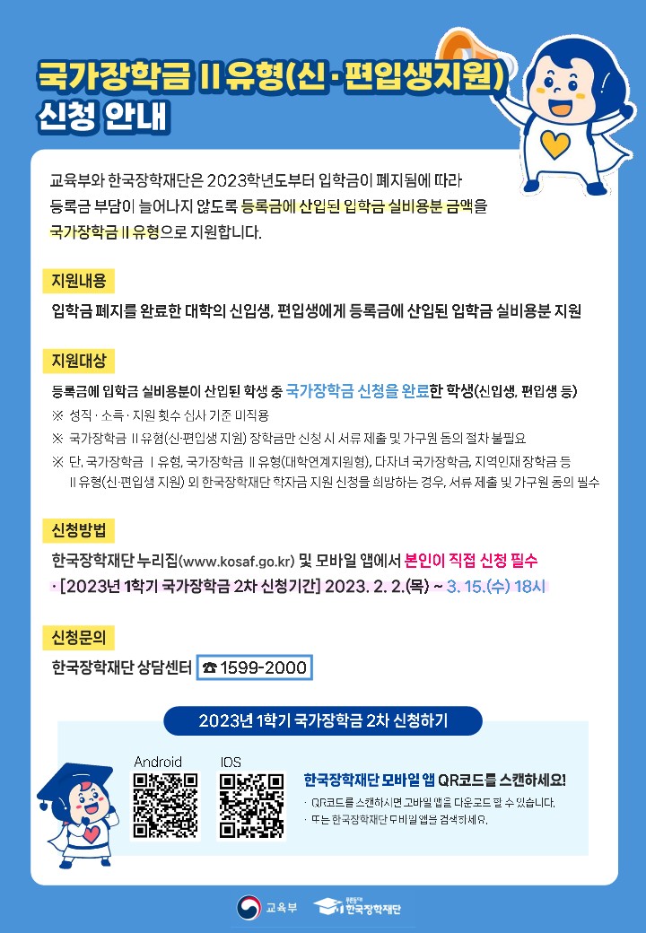 ※ 2023년 1학기 국가장학금 2차 신청 기간: 2023. 2. 2.(목) 09:00 ~ 3. 15.(수) 18:00