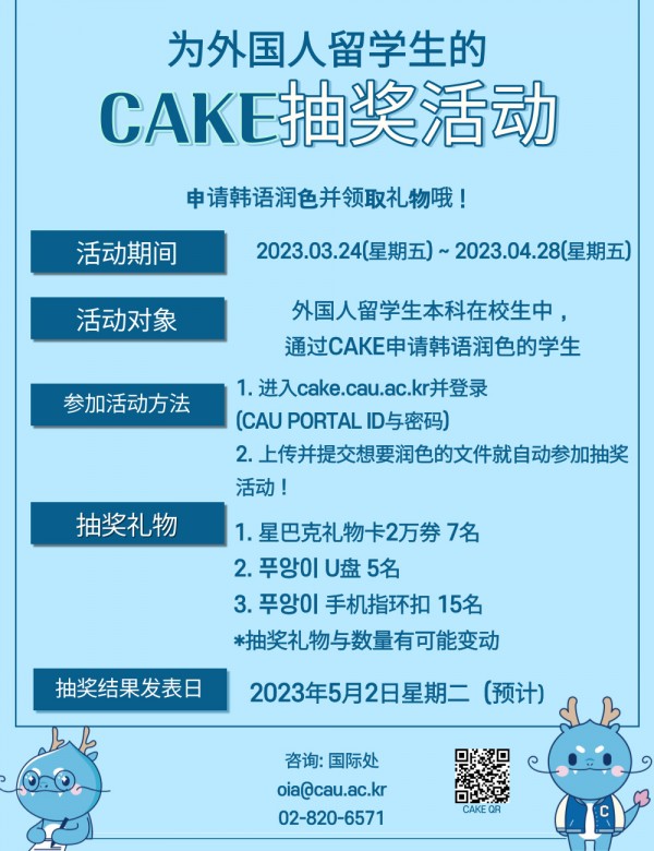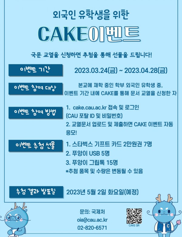 외국인 유학생 대상 국문교열서비스 인지도 및 참여 증대를 위한 '국문교열서비스(CAKE) 이벤트'를 다음과 같이 진행합니다.