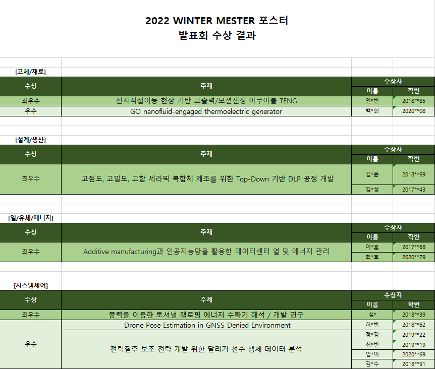 기계공학부 2022 WINTER MESTER 포스터 발표회 수상자 명단을 공지합니다.
