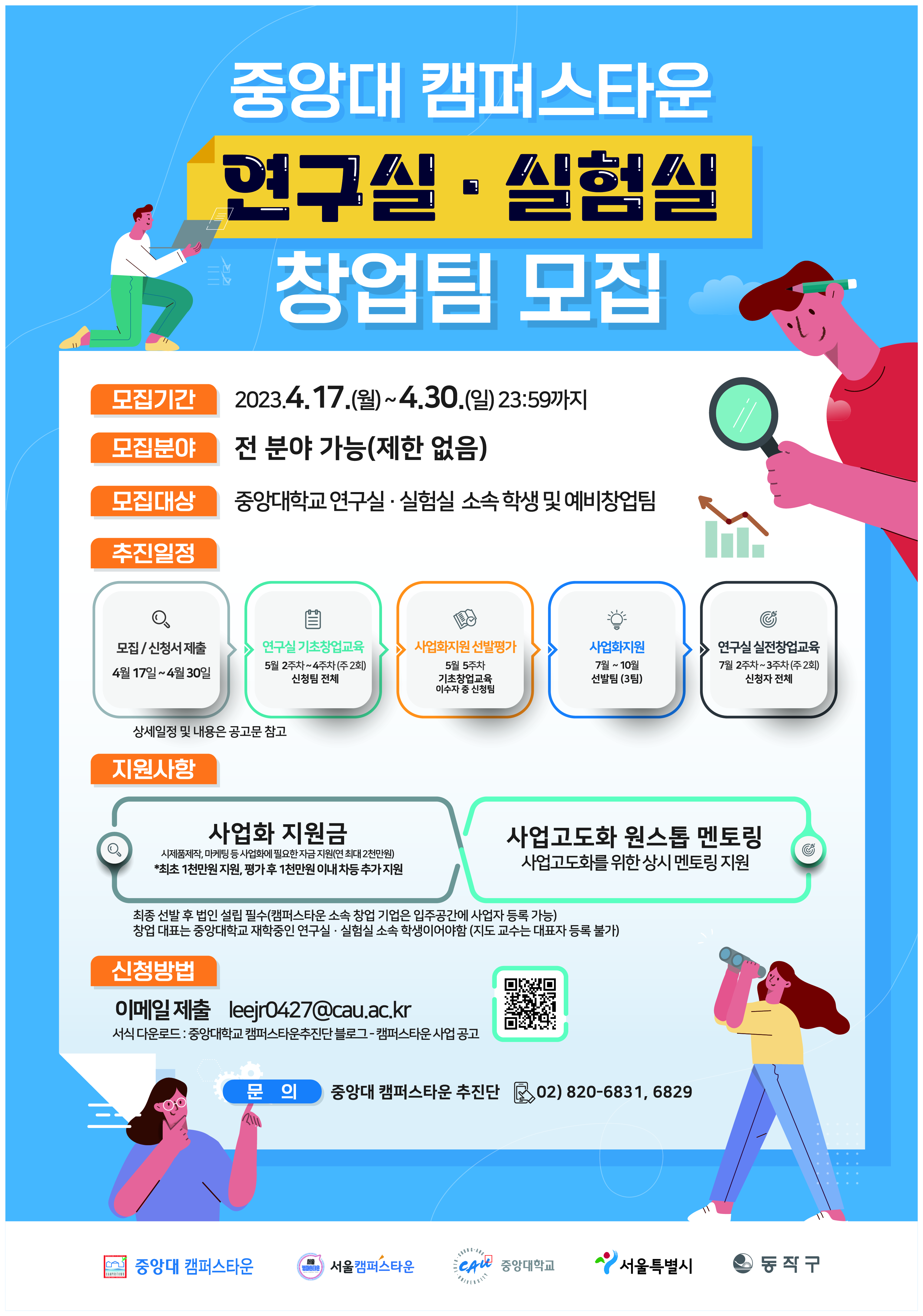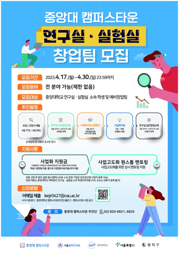 2023년도 중앙대 캠퍼스타운 연구실 실험실 창업팀 모집(~4/30(일))