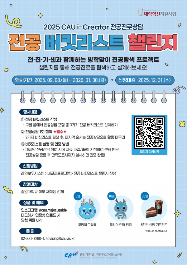 [대학혁신지원사업] 2025학년도 CAU i-Creator 전공진로 상담(전공 버킷리스트 챌린지) 행사 안내