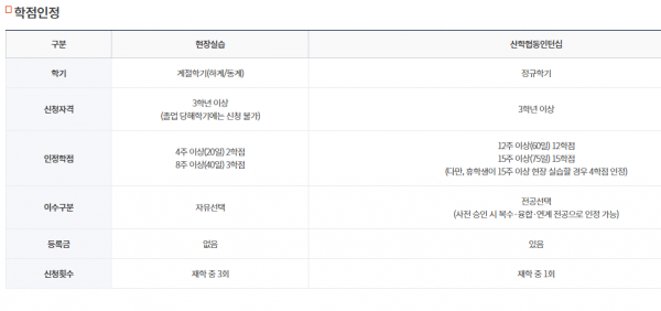 4. 학점 인정 - 산학협동인턴십 부분 (표준 산학협동 인턴십 (1)~ (5) / 최대 15학점 / 이수 : 전공선택)