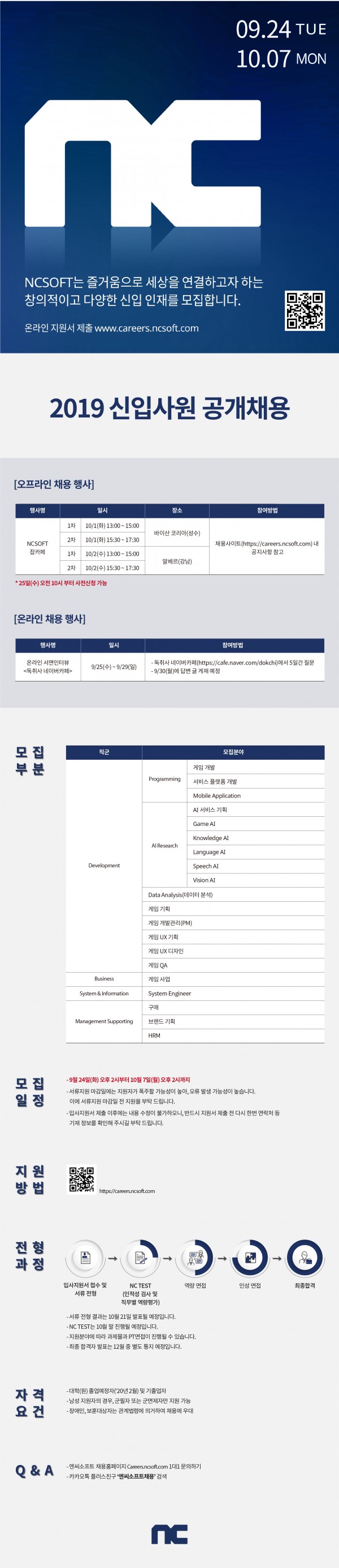 엔씨소프트 2019하반기 신입사원 공개채용(~10/7)