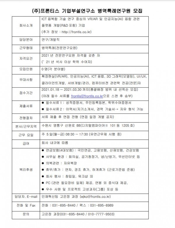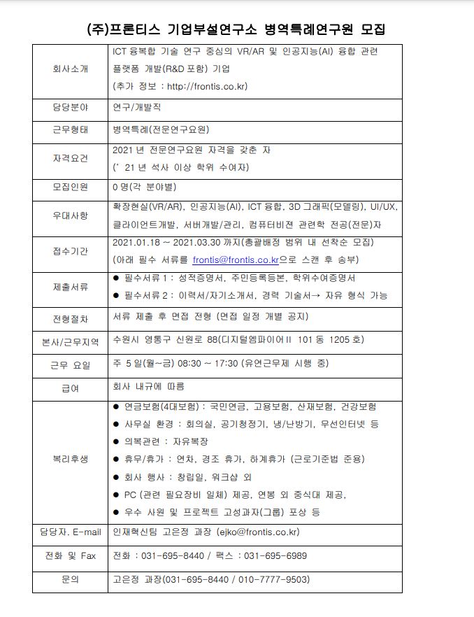 9. 급여 : 회사 내규에 따름 10. 문의 : ㈜프론티스 인재혁신팀 고은정 과장 (ejko@frontis.co.kr)