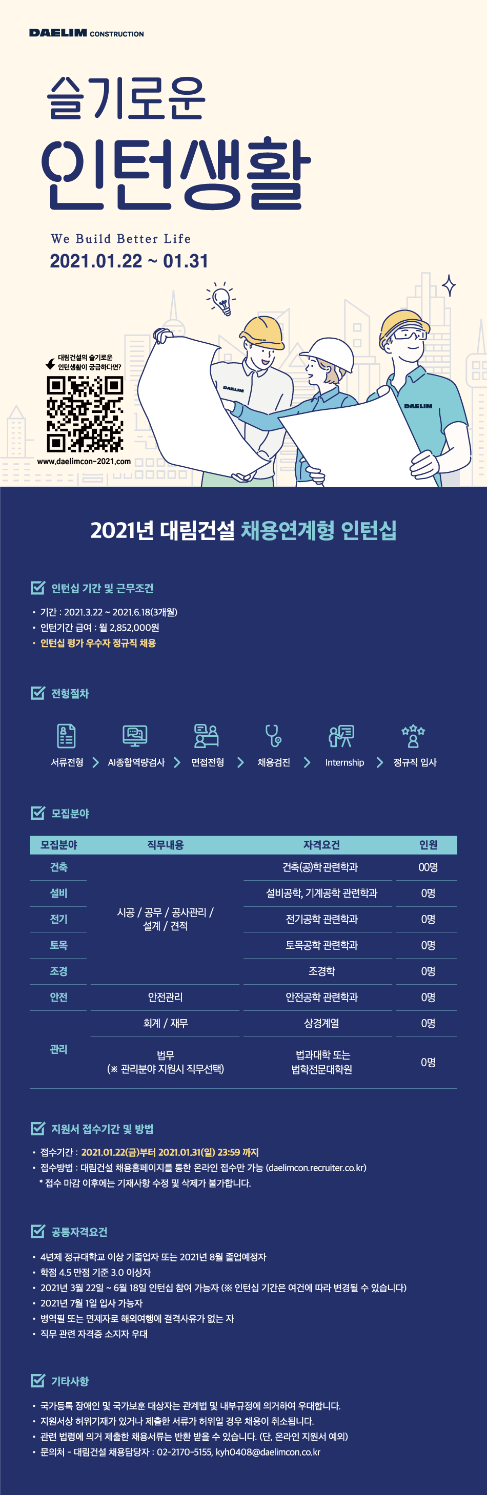 • 지원서상 허위기재가 있거나 제출한 서류가 허위일 경우 채용이 취소됩니다. • 관련 법령에 의거 제출한 채용서류는 반환 받을 수 있습니다.(단, 온라인 지원서 예외) ☎ 문의처 - 대림건설 채용담당자 : 02-2170-5155, kyh0408@daelimcon.co.kr
