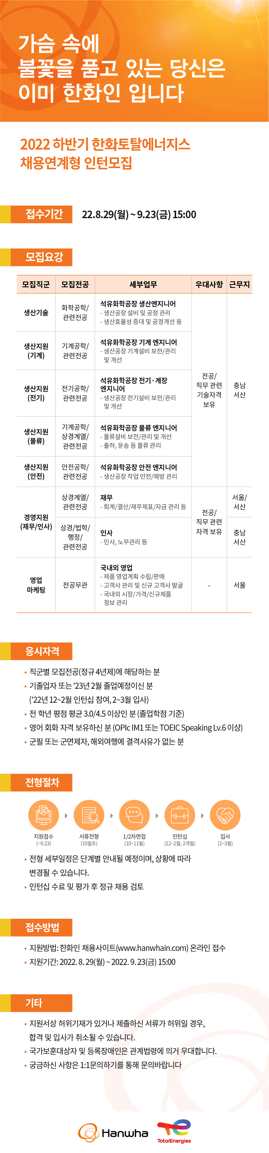 - 지원방법 : 한화인 채용사이트(https://bit.ly/3pPWjPE )온라인 접수