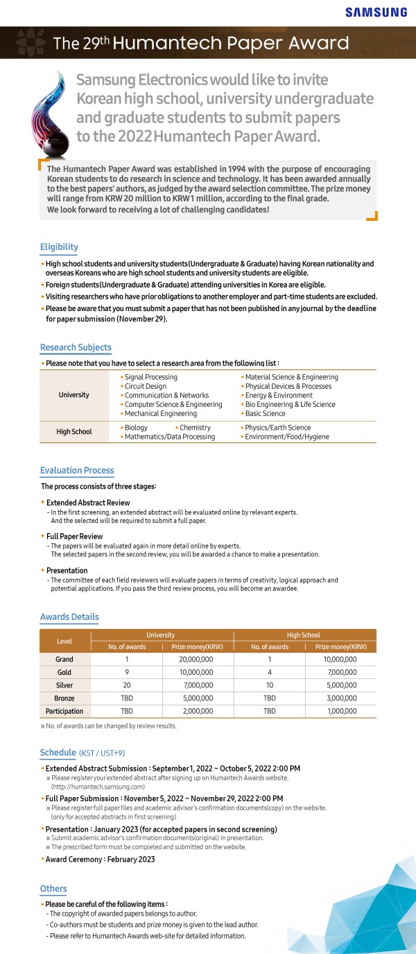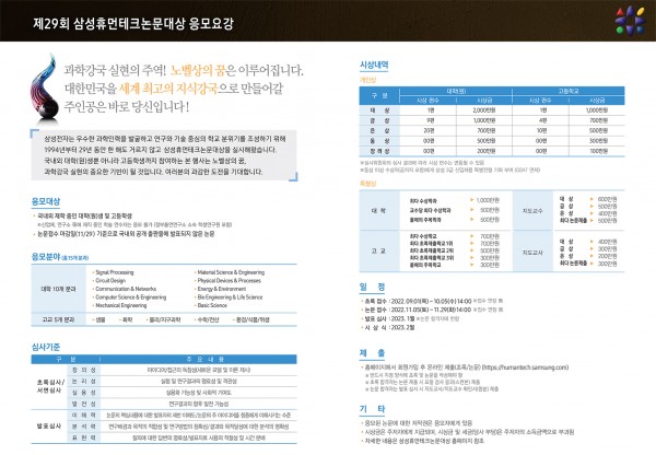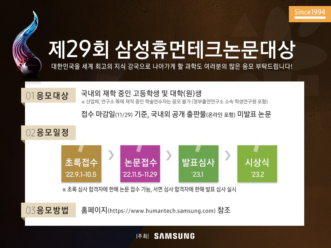 제29회 삼성휴먼테크논문대상이 9/1(목) 초록접수를 시작하오니, 많은 응모바랍니다.