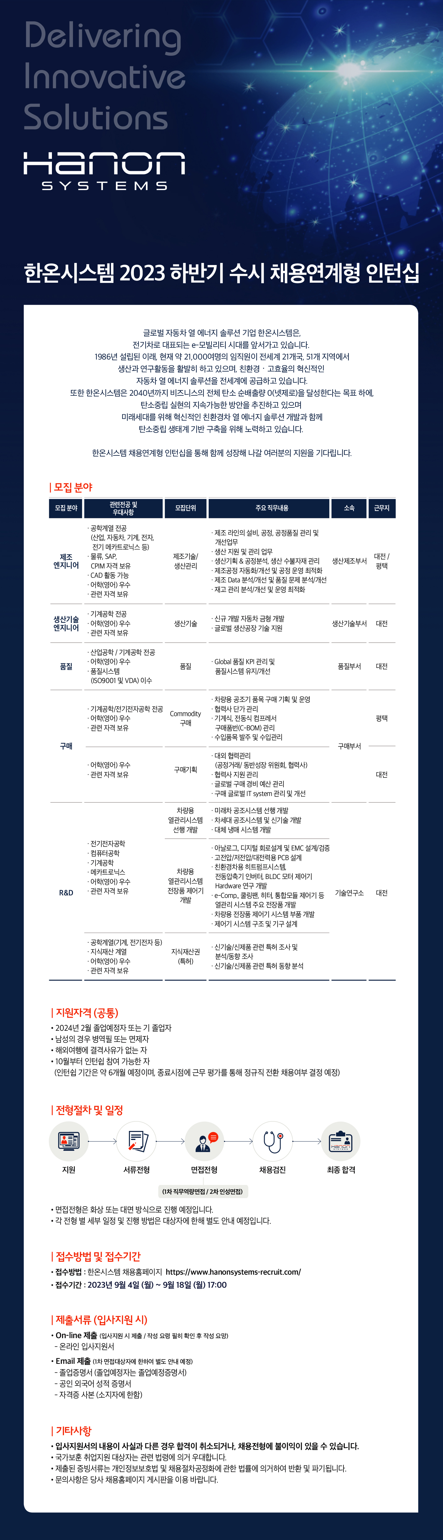 한온시스템 채용연계형 인턴십을 통해 함께 성장해 나갈 여러분의 지원을 기다립니다.