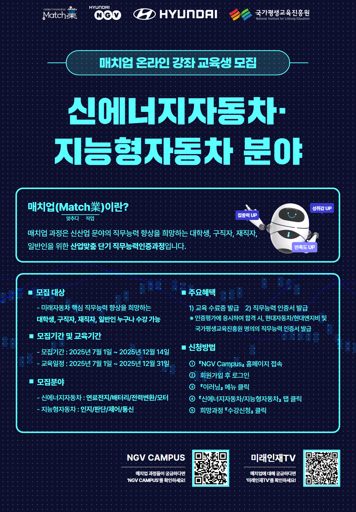 매치업 "신에너지자동차 분야"와 "지능형자동차 분야"의 무료 온라인 특강 사전 신청 안내드립니다.
